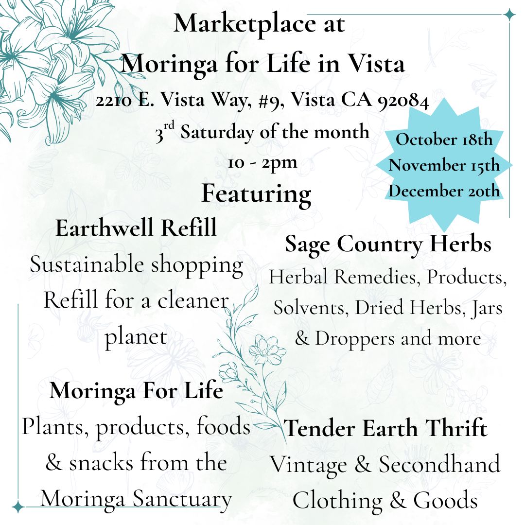 We have just started a monthly marketplace where you can buy herbal products from Shana or pick up whatever you need for making your own herbal creations. Get anything from dry herbs, to waxes, butters, solvents and containers. Check out Earthwell refill, a sustainable way to stock up on natural cleaners and household aids. Moringa For Life will be there offering all things Moringa. Also check out some nice vintage threads from Tender Earth Thrift. This event is free and will happen on the third Saturday of each month from 10 am - 2 pm. Stop ordering everything online. Say hello, save on shipping and have some fun.